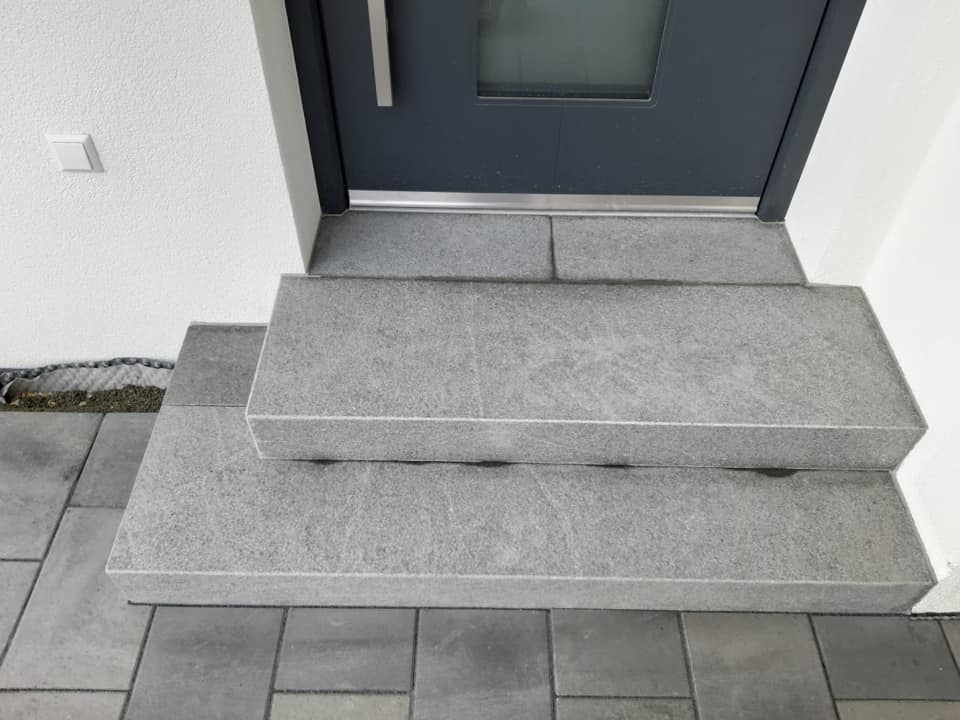 Eine gelunge komplett Umgestaltung mit Treppe, Gabionenwand, Pflaster in Natursteinoptik und Rasernansaat.